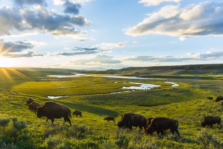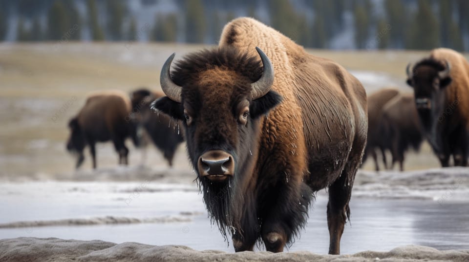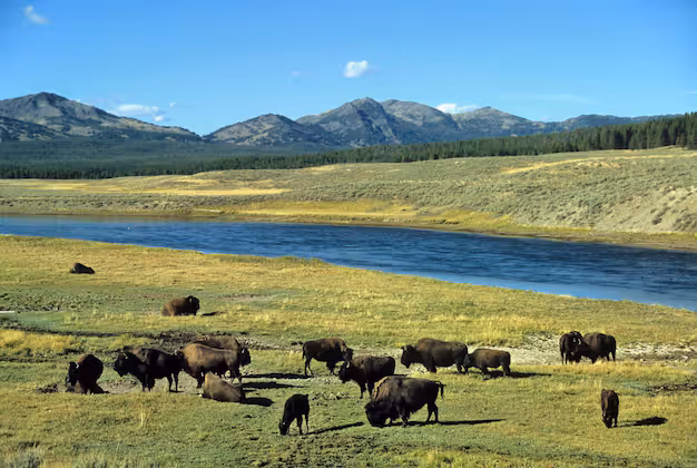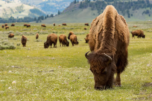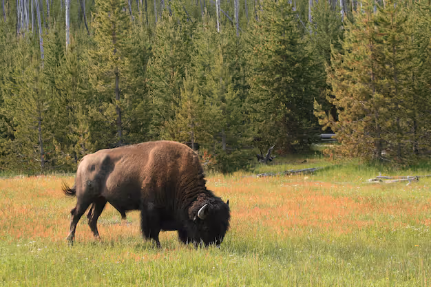 The bison embodies a fascinating paradox: immense strength coupled with serene calm. Weighing up to 900 kilos and almost two meters tall, these giants roam the prairies and river valleys of North America in groups. In Yellowstone National Park in the United States, herds descended from the millions that once populated the continent can still be seen. Its near extinction in the nineteenth century transformed ecosystems and traditional ways of life.