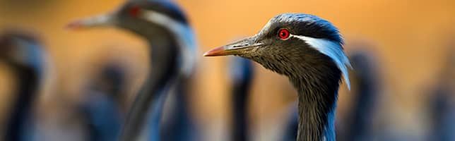 In today's image we see several damselfish cranes in India, noted for their refined silhouette and gregarious behavior. Its presence in ancient stories highlights the elegance of its flight and the admiration it has aroused for centuries. This species makes long migrations through varied landscapes with precise movements. Its red eyes and bluish-gray plumage create an image that stands out in the wetlands where it feeds and rests. It also forms large groups that move forward with a characteristic sound that accompanies each movement.