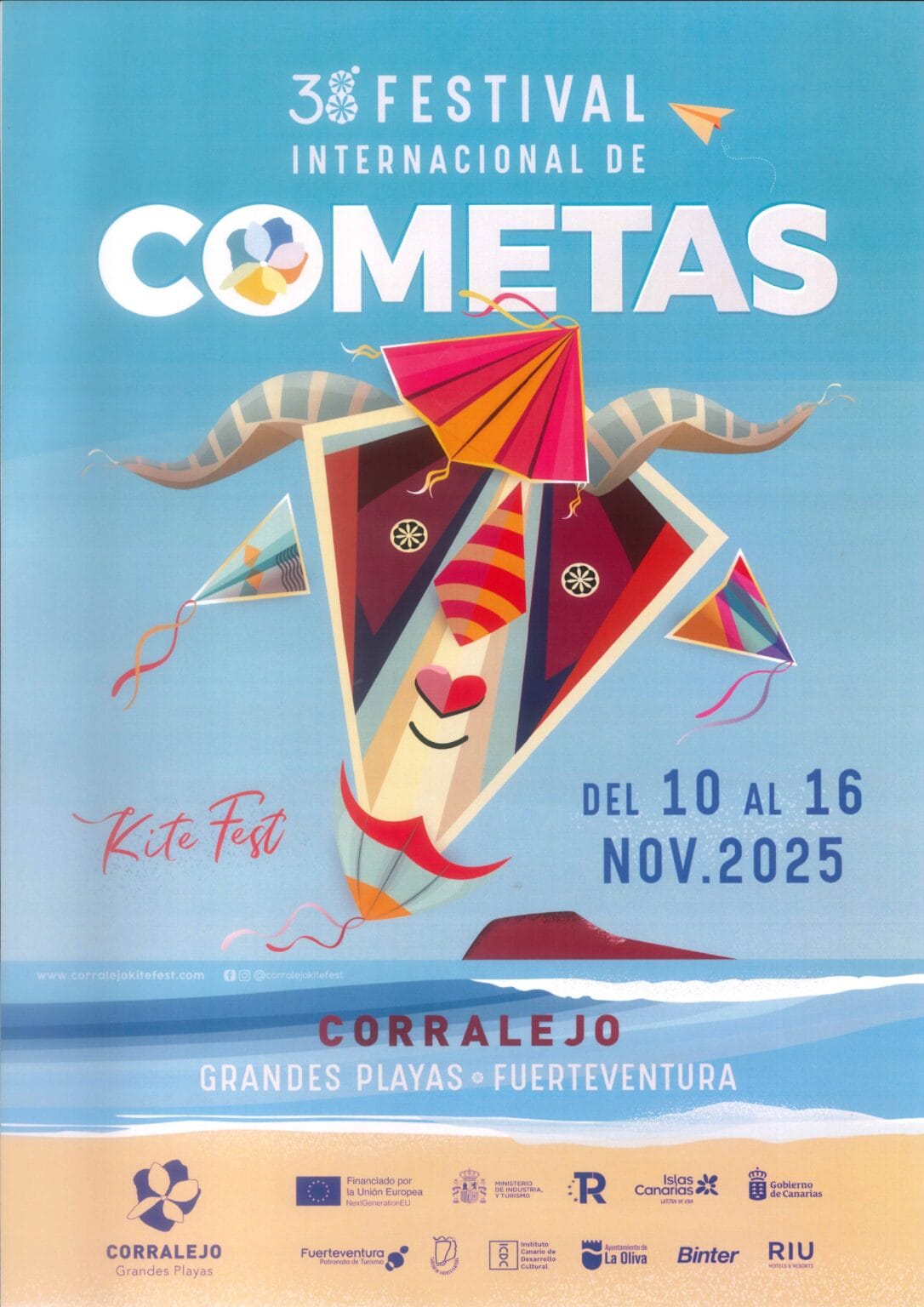 Del 10 al 16 de noviembre, Corralejo, en La Oliva (Fuerteventura, Canarias), se llena de color con el Festival Internacional de Cometas. Este evento, que se celebra desde 1987, reúne a más de 300 participantes de todo el mundo que sorprenden con cometas de todos los tamaños y formas: desde delicadas figuras de aves hasta enormes estructuras que parecen esculturas en el cielo.