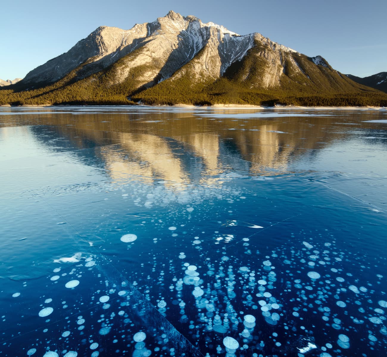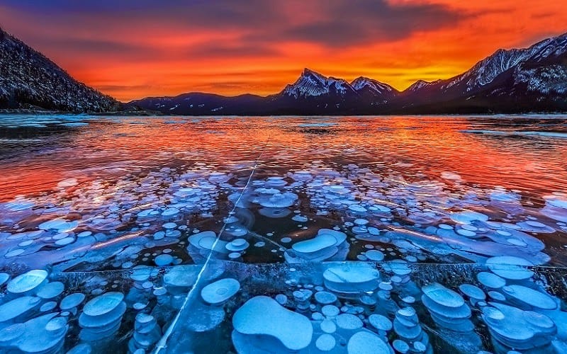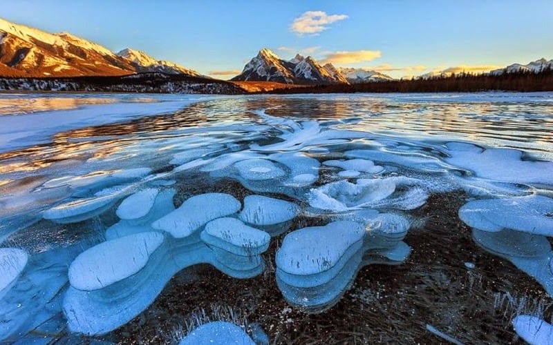 La superficie parece llena de vida, pero todo permanece en silencio. Bajo el hielo transparente se acumulan burbujas blancas, como si el tiempo se hubiera detenido a mitad de una reacción. Este paisaje tan singular se encuentra en el lago Abraham, el mayor embalse de Alberta, en Canadá, situado en la zona de Kootenay Plains, al pie de las Montañas Rocosas.