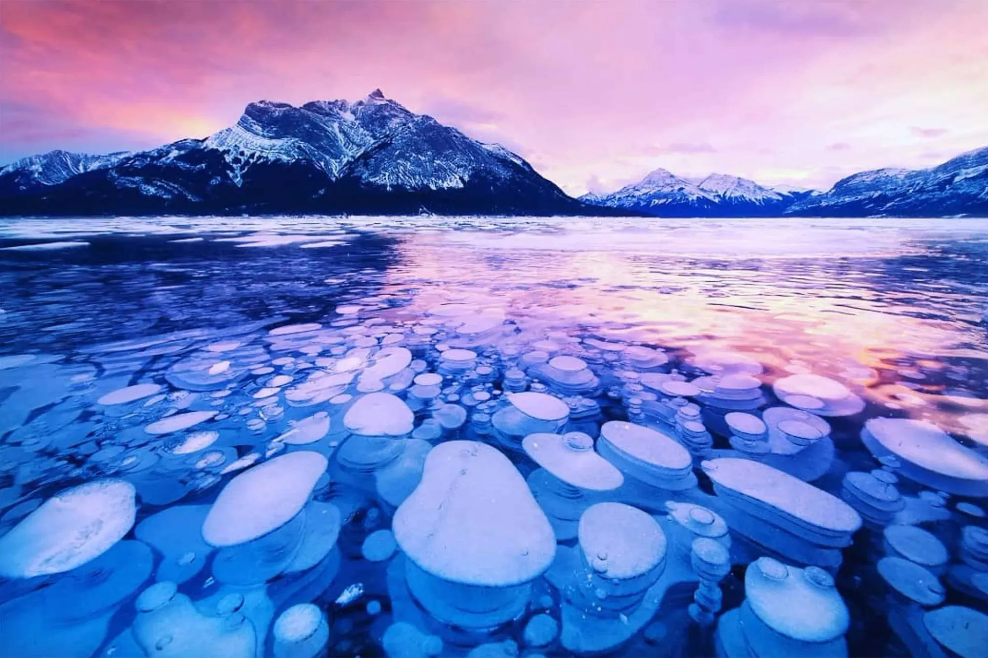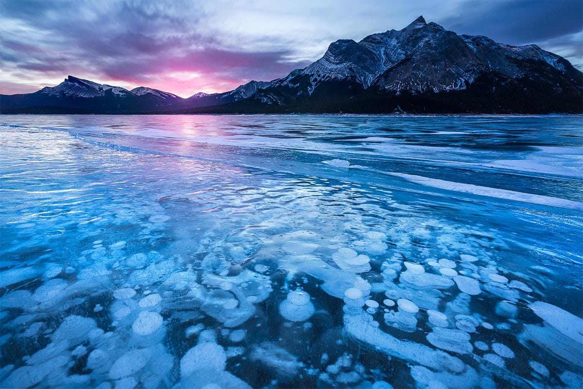 La superficie sembra piena di vita, ma tutto resta silenzioso. Sotto il ghiaccio trasparente, si accumulano bolle bianche, come se il tempo si fosse fermato nel mezzo di una reazione. Questo paesaggio unico si trova sul lago Abraham, il più grande bacino idrico dell'Alberta, Canada, situato nell'area delle Pianure Kootenay, ai piedi delle Montagne Rocciose.