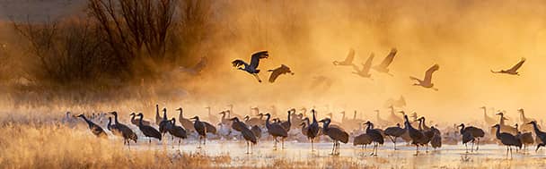 Cada diciembre, al amanecer, un coro de llamadas resonantes llena los humedales del Refugio Nacional de Vida Silvestre Bosque del Apache, en el corazón de Nuevo México, Estados Unidos. Este santuario de más de 23 mil hectáreas se prepara para acoger uno de los espectáculos más emocionantes de la naturaleza: el regreso de las grullas canadienses tras su largo viaje estacional. Pronto, decenas de miles de gansos nivales y otras aves migratorias se unen al espectáculo, llenando el cielo de vida y movimiento.