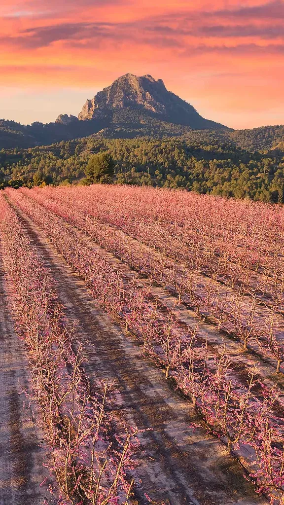 La fioritura di Cieza trasforma ogni anno la valle della Segura a Murcia in un ambiente vivace dove i campi sono tinti di rosa e bianco. Gli alberi da frutto si risvegliano con un'esplosione cromatica che annuncia l'arrivo della primavera e avvolge il paesaggio in un'atmosfera quasi irreale. Camminare tra gli alberi ti permette di sentire il profumo fresco dei petali e osservare come la luce del sole valorizzi i toni morbidi che caratterizzano questa celebrazione naturale.