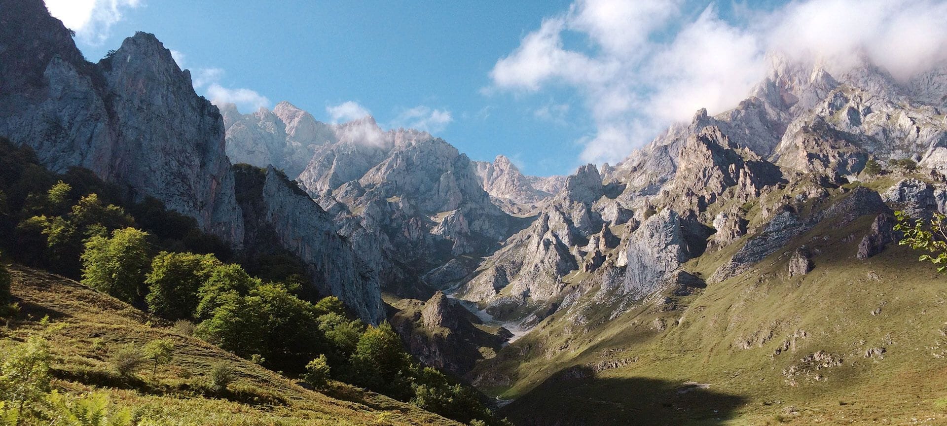 Riaño, situado en la provincia de León en España, está enclavado en el Parque Nacional de los Picos de Europa, una región famosa por sus picos montañosos escarpados y valles pintorescos. Durante el otoño, el paisaje se transforma cuando los árboles caducifolios muestran tonos de naranja, rojo y amarillo, creando un contraste llamativo con las coníferas verde oscuro y el fondo rocoso de las montañas.