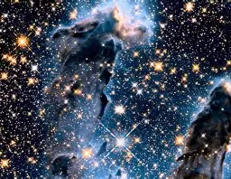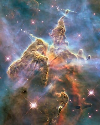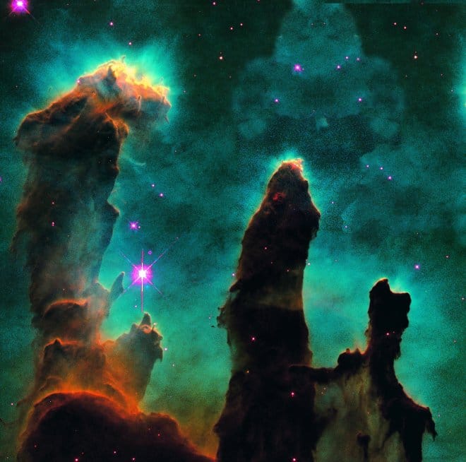 These huge, needle-shaped, diagonally oriented structures are composed almost entirely of gas and dust —the raw material of stars. Inside, the force of gravity compresses knots of material that, little by little, ignite new stars. Many of them already shine on the edges of the pillars, like small lights that announce the beginning of their cosmic life.