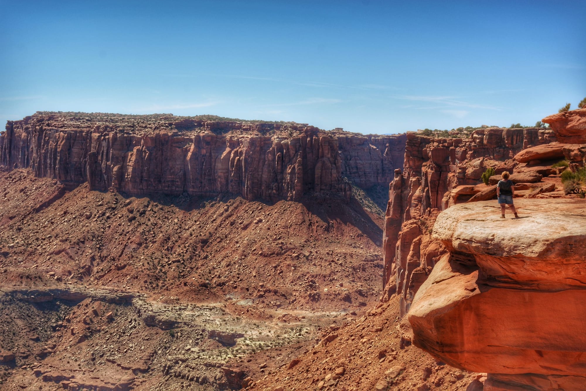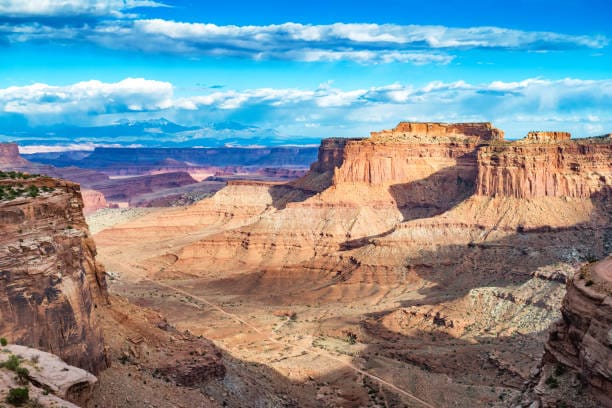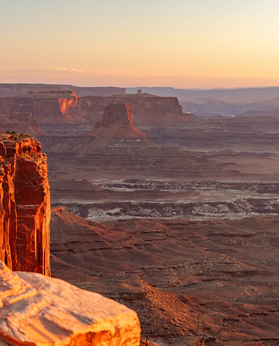 Il tramonto nel Canyonlands National Park, vicino a Moab, Utah (Stati Uniti), trasforma il paesaggio in un memorabile gioco di luci e ombre. Il sole scende su un territorio deformato dal fiume Colorado, mettendo in risalto profondi canyon, altopiani e guglie rocciose che cambiano colore ogni minuto. I toni rossi, ocra e dorati si intensificano, mentre il cielo si apre su orizzonti ampi e puliti. Il silenzio del parco e la sensazione di immensità accompagnano la fine della giornata e rafforzano un'esperienza serena e immersiva.