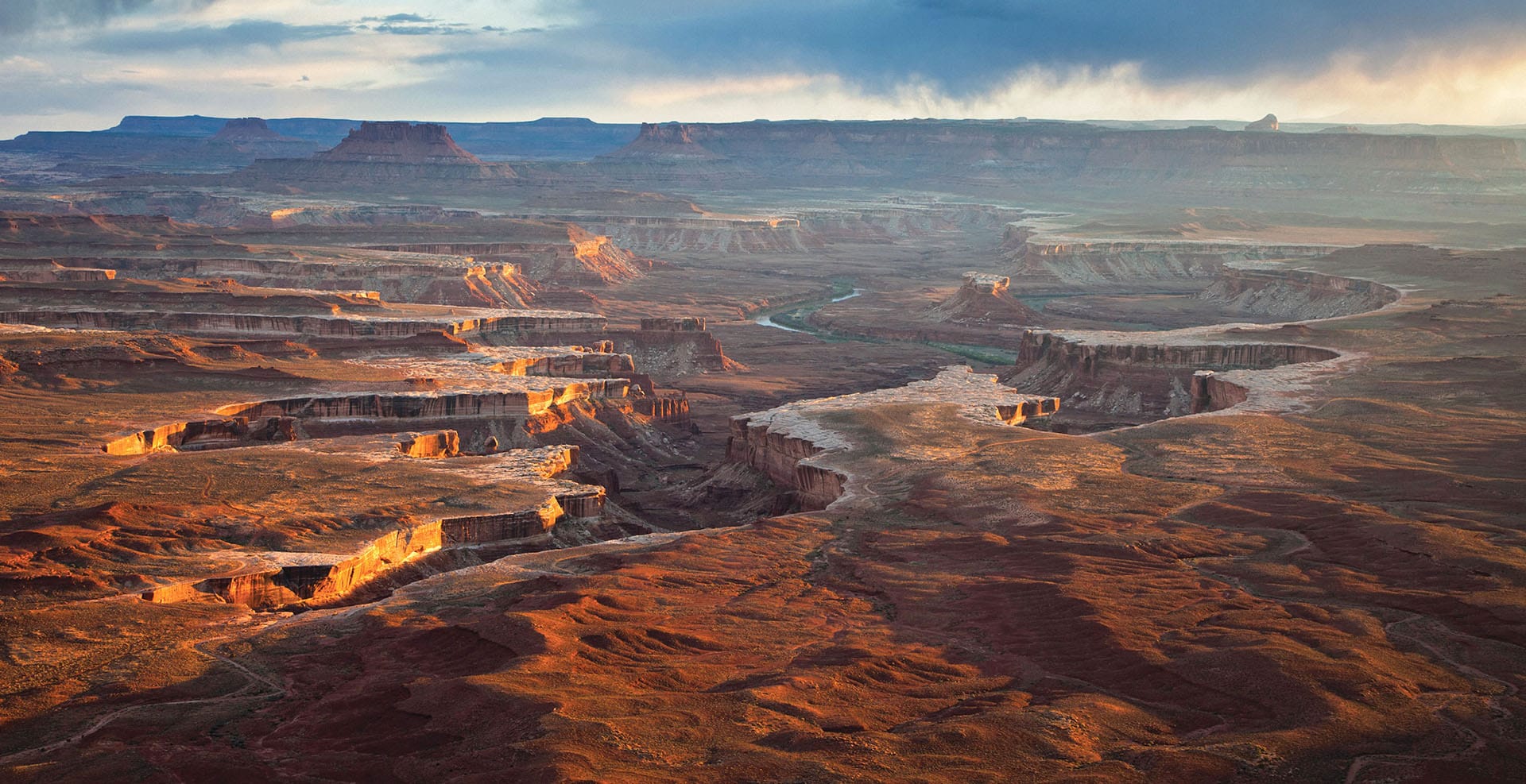 Sunset in Canyonlands National Park, near Moab, Utah (United States), transforms the landscape into a memorable play of light and shadow. The sun descends on a territory shaped by the Colorado River, highlighting deep canyons, plateaus and rock spires that change color every minute. The red, ochre and gold tones intensify, while the sky opens up into wide and clean horizons. The silence of the park and the feeling of immensity accompany the end of the day and reinforce a serene and immersive experience.