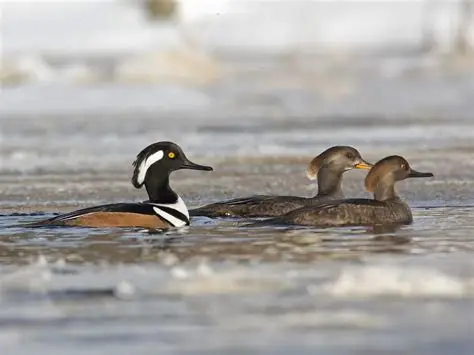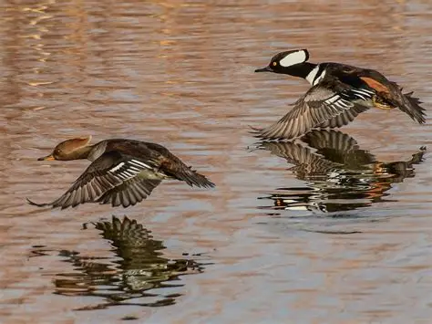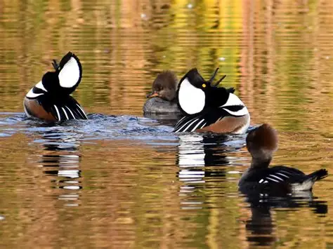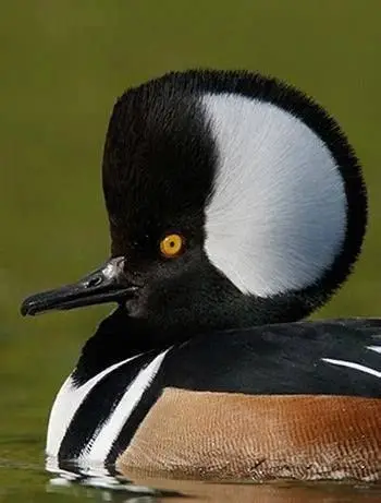 Every fall, Oregon's tranquil waterways come alive with the presence of the serreta capuchona, a small diving duck native to North America. Agile underwater, it dives to catch fish and other food. Males are noted for their white fan-shaped crests, dark heads and chestnut sides, while females have brownish-grey plumage and more inconspicuous crests.