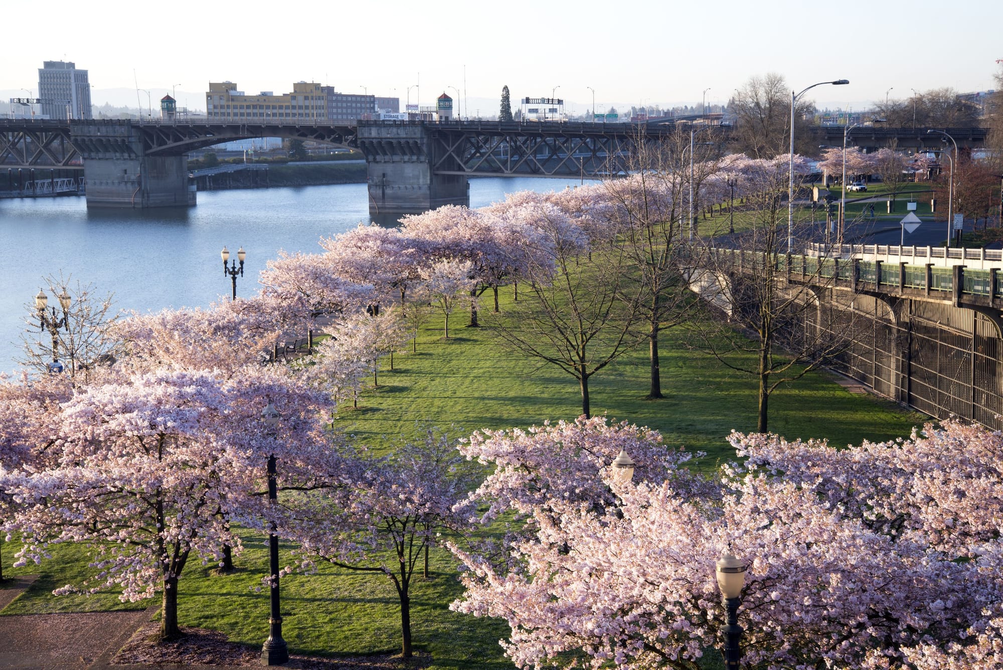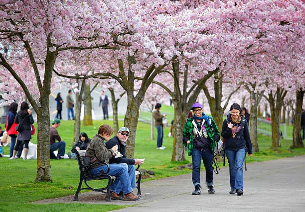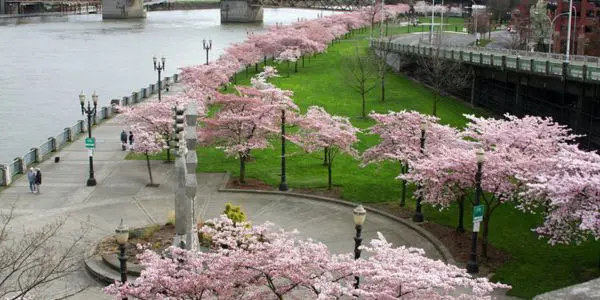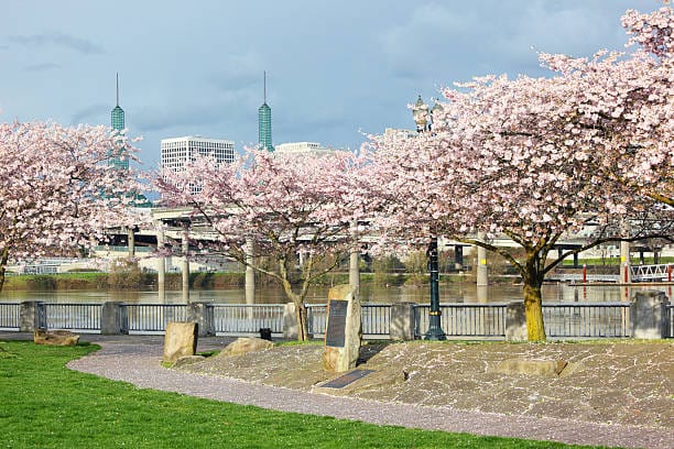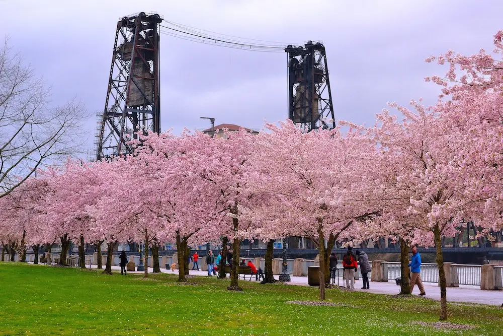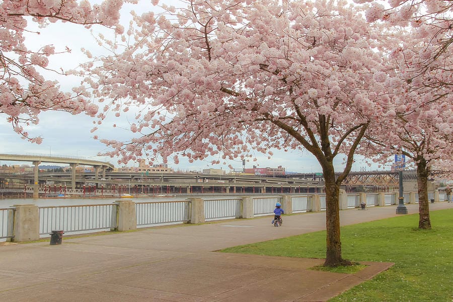 Al Tom McCall Waterfront Park di Portland, Oregon, i ciliegi in fiore trasformano il lungofiume in un paesaggio sereno che attira migliaia di visitatori ogni primavera. Le sue sfumature rosa sembrano fluttuare sui sentieri e creare un'atmosfera quasi onirica che invita a camminare senza fretta. L'atmosfera è arricchita dal contrasto tra la natura vivace della città e l'architettura moderna, trasformando ogni angolo in una scena degna di contemplazione e fotografia.