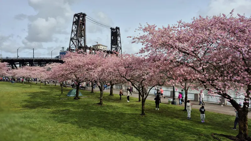 At Tom McCall Waterfront Park in Portland, Oregon, cherry blossoms transform the riverfront into a serene landscape that attracts thousands of visitors each spring. Its pink hues seem to float on the paths and create an almost dreamlike atmosphere that invites you to walk without haste. The atmosphere is enriched by the contrast between the city's vibrant nature and modern architecture, turning every corner into a scene worthy of contemplation and photography.