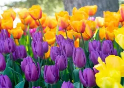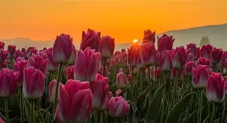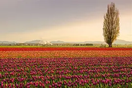 The tulip fields of the Skagit Valley in Washington, United States, transform a wide agricultural plain into a mosaic of color every spring. Perfect rows of flowers stretch between mountains and irrigation canals, creating an orderly and luminous landscape linked to commercial cultivation and a long floral tradition.