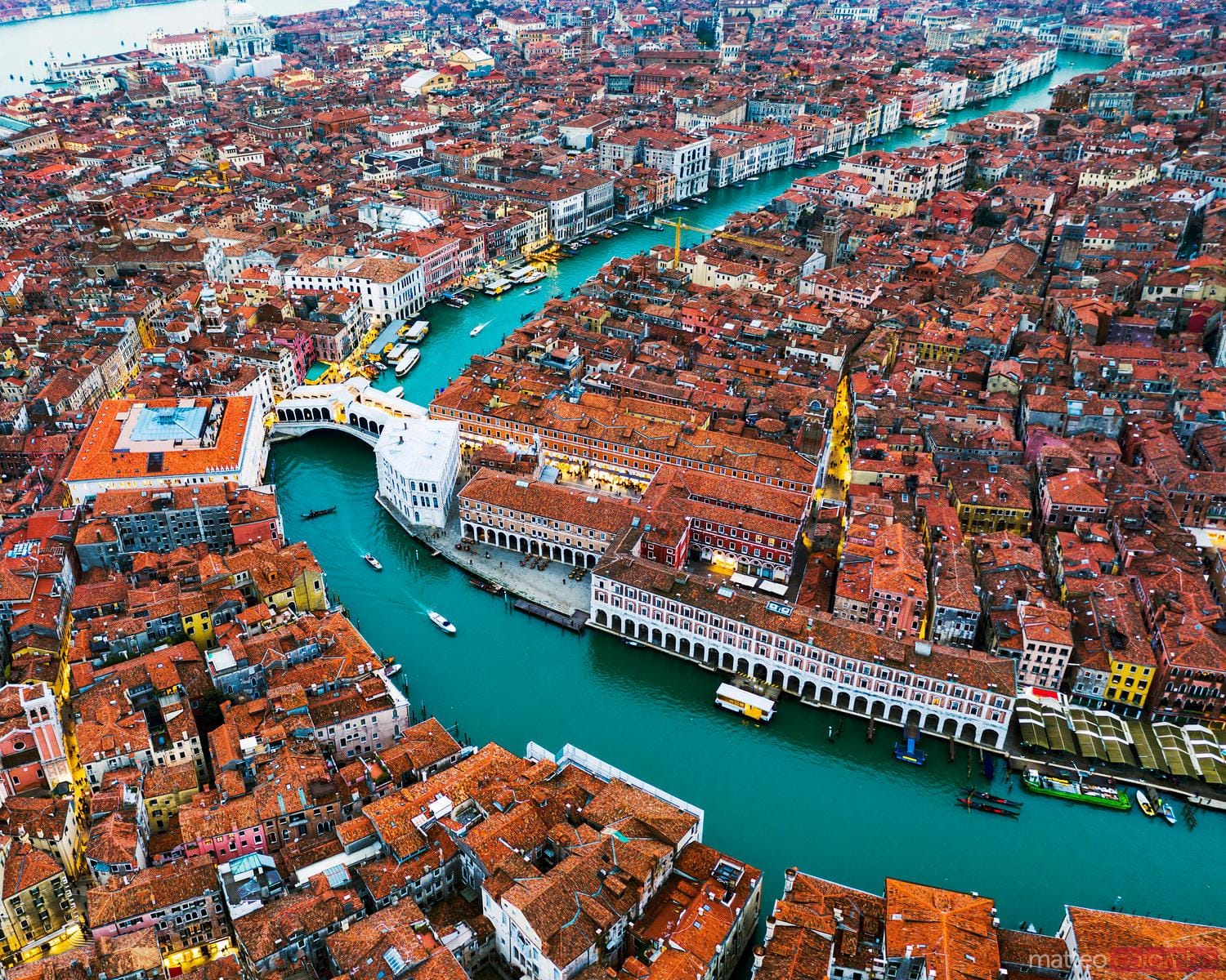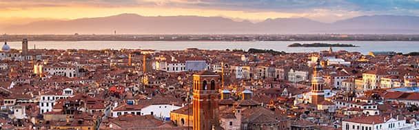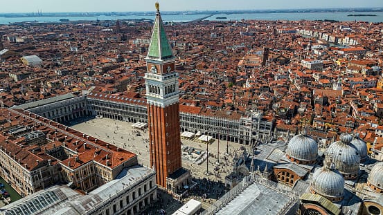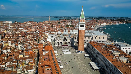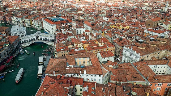 Vedere Venezia dall'alto è ipnotico, ma la vera magia di questo gioiello italiano risiede nelle sue mura e nei suoi canali. Fondata nel V secolo su un insieme di isole nella Laguna Veneziana, la città sorse dalle paludi e divenne una potenza marittima. Nel Medioevo, si evolse fino a diventare un importante centro commerciale tra Europa e Oriente, che alimentò grande ricchezza e notevole crescita culturale. La grandiosità della città si riflette nei suoi palazzi gotici, nell'arte rinascimentale e in monumenti come la Basilica di San Marco, il Palazzo Ducale e il Ponte Rialto.